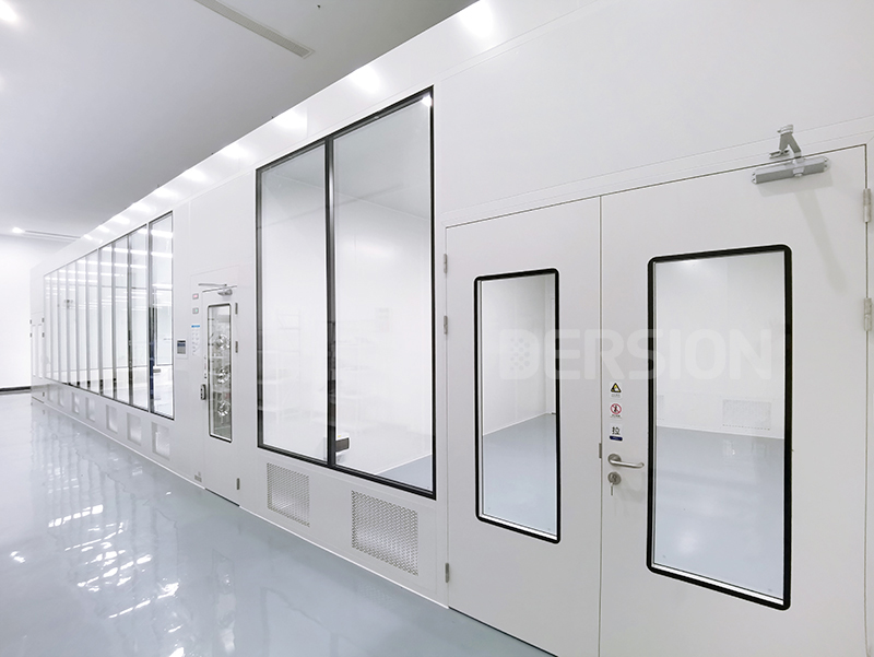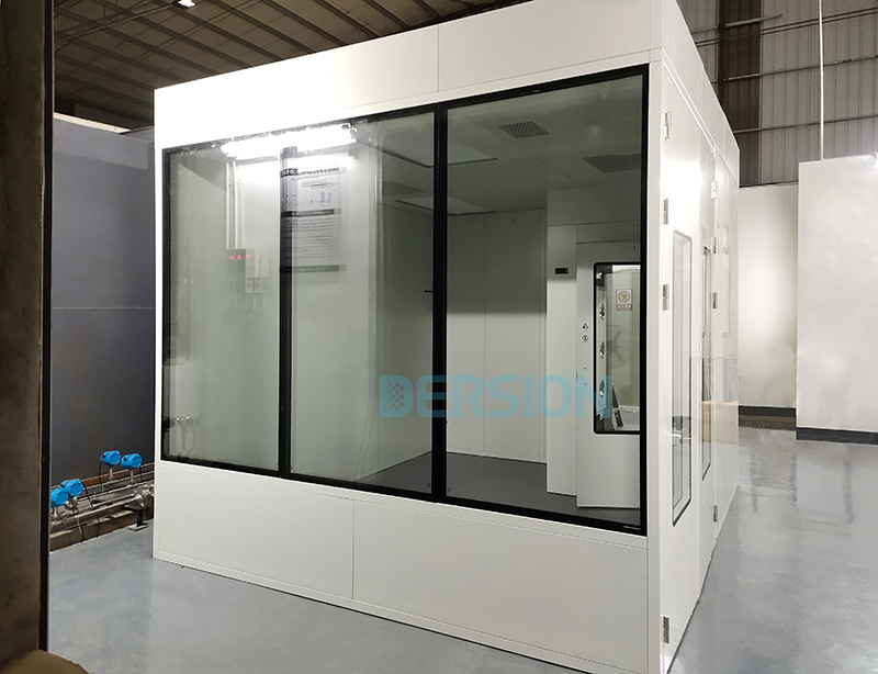中大研究院此款實驗室外形尺寸3500W*3000D*2850H,潔凈度等級要求為千級,考慮到東莞天氣原因需要配備空調(diào)及除濕機,為保證除濕效果,潔凈室采用頂送頂回的結(jié)構(gòu),其他凈化設(shè)備包括風(fēng)淋室、逃生門等。