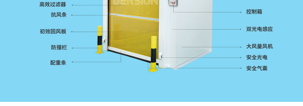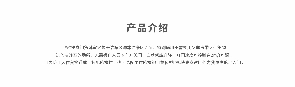 自動(dòng)卷簾門風(fēng)淋室是一種通用性較強(qiáng)的局部?jī)艋O(shè)備,安裝于潔凈室與非潔凈室之間,是貨物進(jìn)入潔凈室所需的通道。當(dāng)貨物進(jìn)入潔凈區(qū)時(shí)需經(jīng)貨淋室去除貨物所攜帶的塵埃,能有效的阻斷或減少塵源進(jìn)入潔凈區(qū)。貨淋室前后兩道門為電子互鎖,可起到氣閘的作用,阻止未凈化的空氣進(jìn)入潔凈區(qū)域。且可以作為不同等級(jí)潔凈室的緩沖室,防止貨物進(jìn)出時(shí)產(chǎn)生的交叉污染。