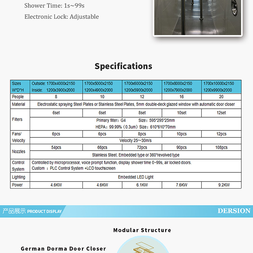 | Control | Controlled by microprocessor, voice prompt function, display shower time 0~99s, air locked doors. | ||||