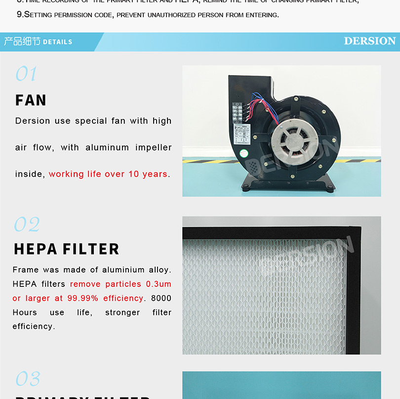 Primary filter:G4 Size:595*295*25mm HEPA:99.99%(0.3um)Size:610*610*70mm |